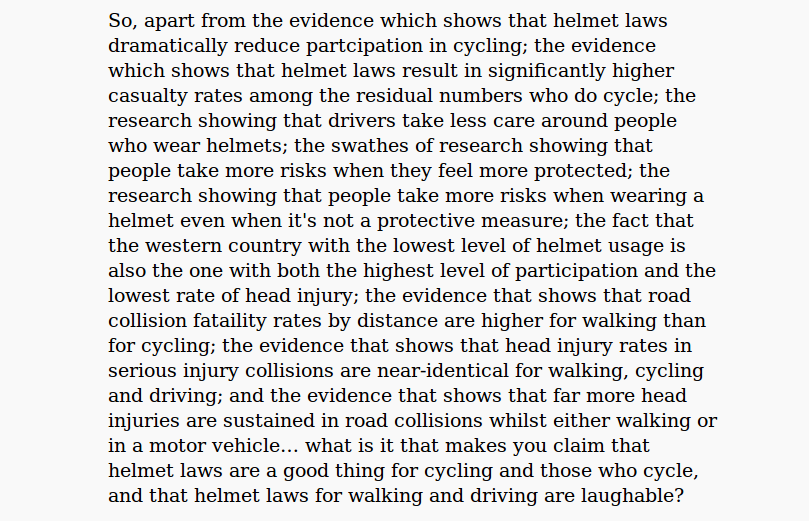 Yep, and a LOT more likely to be the case than when the same claims are made of a cycle helmet. If cycle helmets were proved to be as effective as motorcycle helmets then the debate would solely be around personal choice but as they are not (mainly because a cyclist wouldn't want to wear a motorbike helmet!) then the debate gets more difficult as helmet effectiveness is not a given.