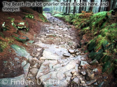 So Your on the Top of Win hill facing Sheffield/The lower Res, and then head back down a stone path, through a wooded area, then hit a Cross road and a fence. Now I'm not sure if your supposed to ride it, but you then go over the fence (though a gate) through a rough wooded section, looks like a stream of some sort, then come across another cross road, again go straight on, now it really gets interesting, to your right you have a little Vally with a stream running down. The path is very narrow, rocky, with some large drops in. It brings you out next to teh path across the lower dam.