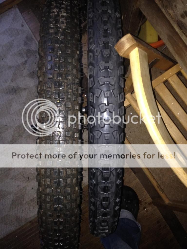 On-One Chunky Monkey mounted on a 50mm Rabbit Hole rim (on the right in the photo), next to a 3" Surly Knard. I'm hoping the CM's will be the perfect 29+ winter tyre, worth a punt at £19 each I thought. Will test this weekend.