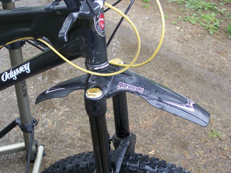 You can tweak it to get the nose almost touching the tyre to reduce the amount of spray that gets carried through. I drilled some other holes in mine to let me get a better fit with different forks. This also lifts the tail so it catches a bit more of the spray projected up off the wheel. As suggested a crud downtube guard helps to catch this also.