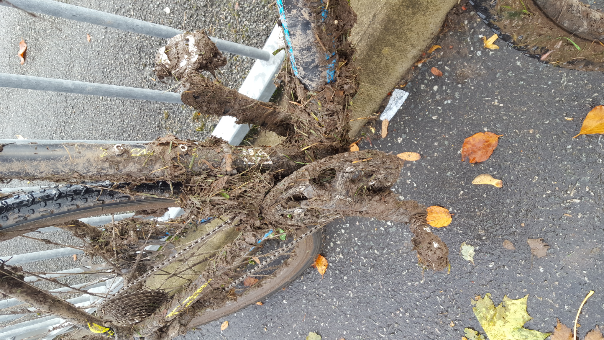 The aftermath of last Sunday, very clogged up with mud, also had a bit of a push due to slicing the front tyre.