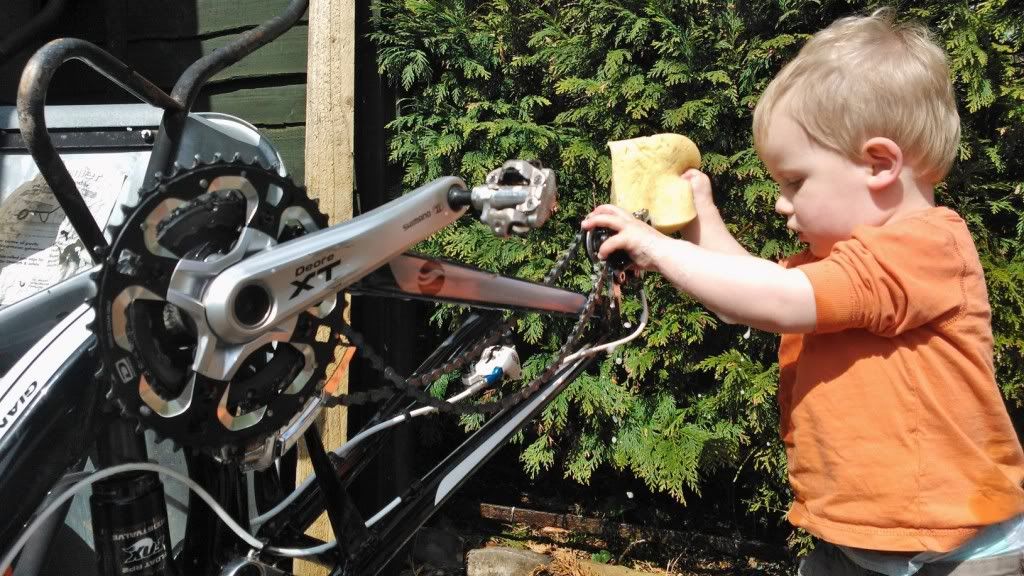 my son loves to help wash the bikes too. i think spraying his dad with the hose is the fun bit though... good point re rotors and other bits for trapping fingers - doesn't bear thinking about.