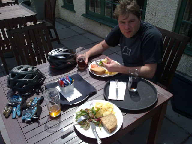 Monday ([b]Exmoor[/b]): Setting off, we immediately faced a viscous bridleway up to County Gate. Yesterday's trials were all too apparent and we resorted to pushing. The traversing bridleways heading to Smallacombe were fine, the climb out of Smallacombe was pain. Two gels each had little impact on our fatigue. But the 3.5 mile descent down Hawkcombe made it all worthwhile. In places it's narrow and tech, in others it's wider and warp speed. We stopped at the pub in Porlock: