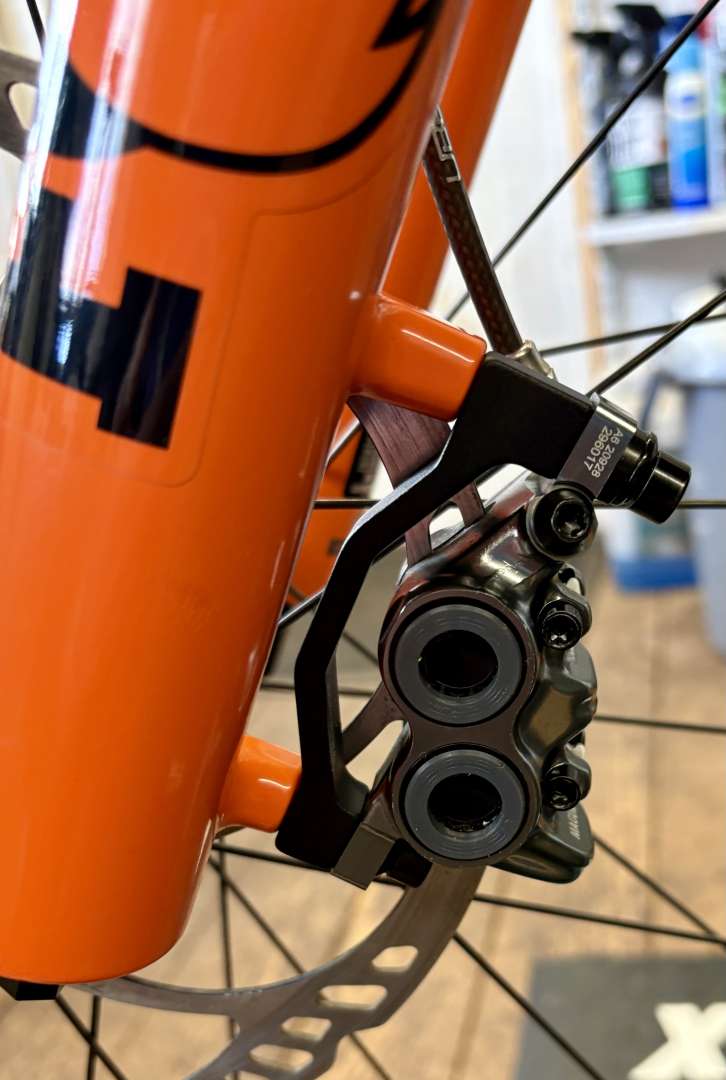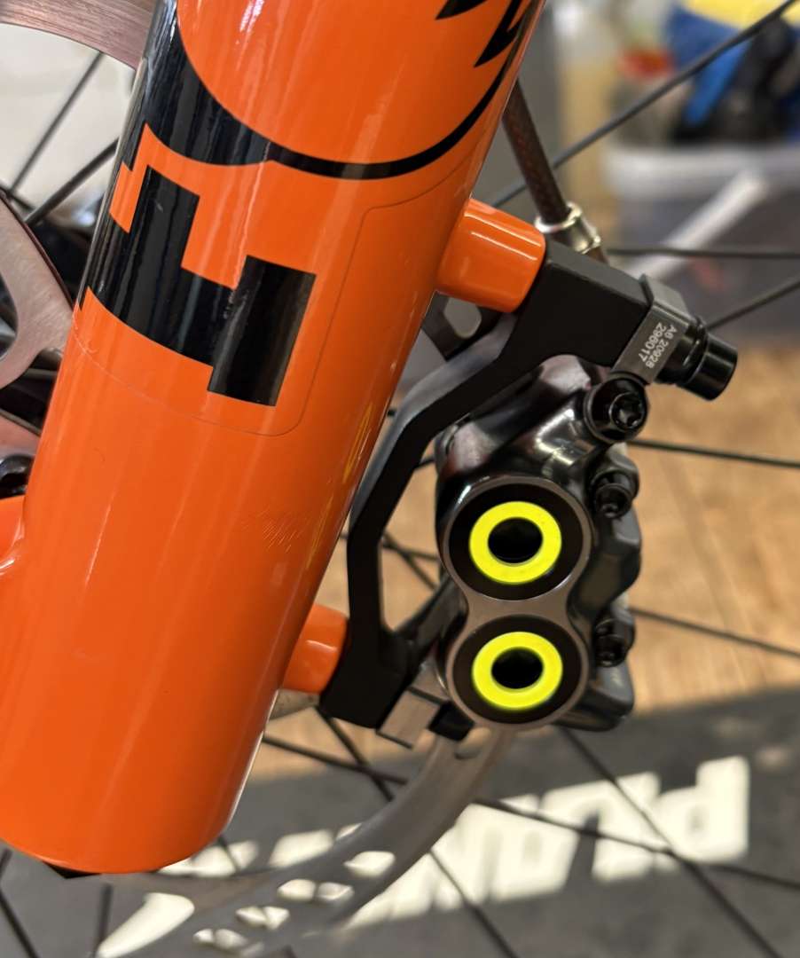 Last "upgrade". Cannot get Orange OEM Magura caliper rings. So these are ebay 3d printed specials. Holographic apparently but I was just happy to have something mostly matching the frame colour.