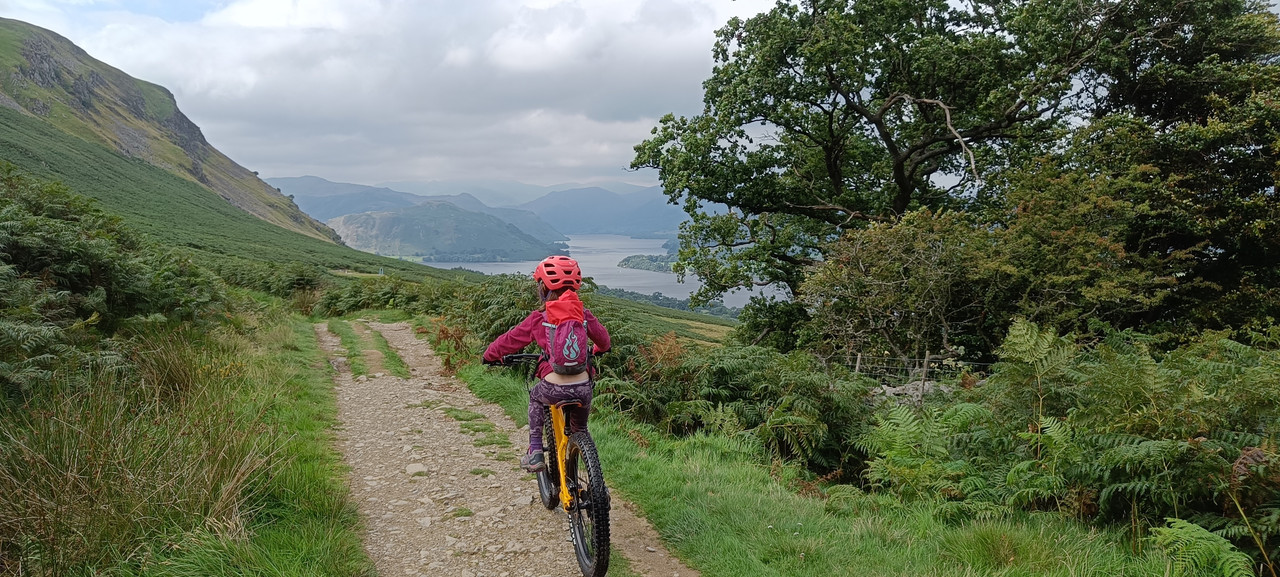 Get dropped by car at top latrigg carpark (gale road). Worth a ride/push to the viewpoint overlooking Keswick near Latrigg summit along a well made track (designed for wheelchair users but a bit steep in places for 6 yr old to ride maybe). Then return and head left where the path splits and head down the BW towards Keswick (spooney green lane). The bottom of this is steep, but can head off left just as it steepens to either go out and back avoiding the main steepness, or continue along to pop out above Calvert Trust stables.