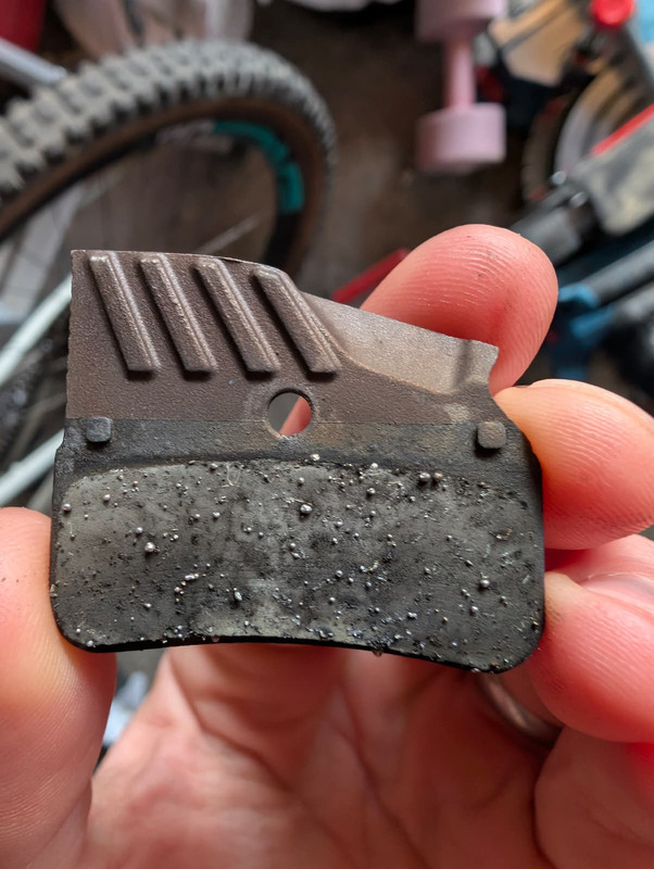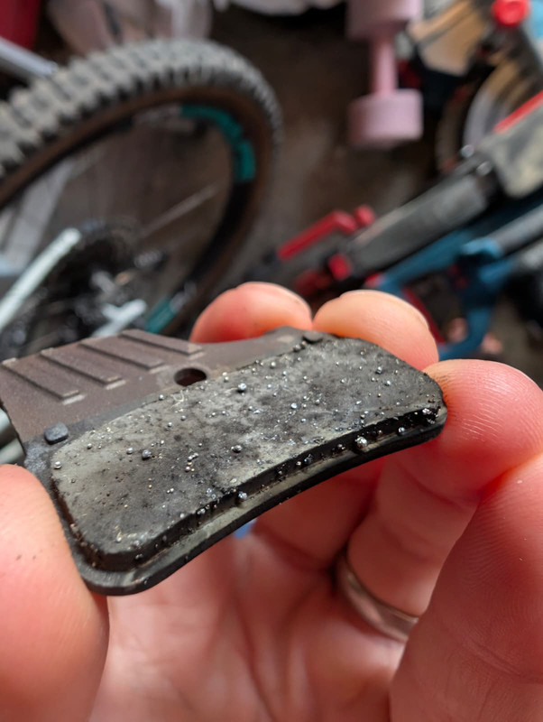 It looks like blobs of solder all over the pads. And yes, they are sintered pads, I did wonder if I potentially over-heated them with the MAP gas blowtorch, but I didn't think I got them that hot. Regardless, their braking performance had gone so they were definitely contaminated.