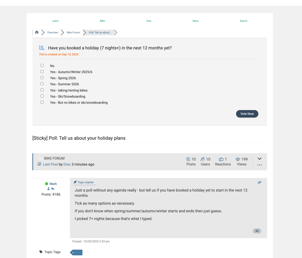 I voted yesterday: I've planned two trips already, but they're both ski trips as we need to go abroad to ski. The accomodation was booked about two months ago, the season passes were bought in March (literally in the car on the way back from the last trip of the 2024 season).