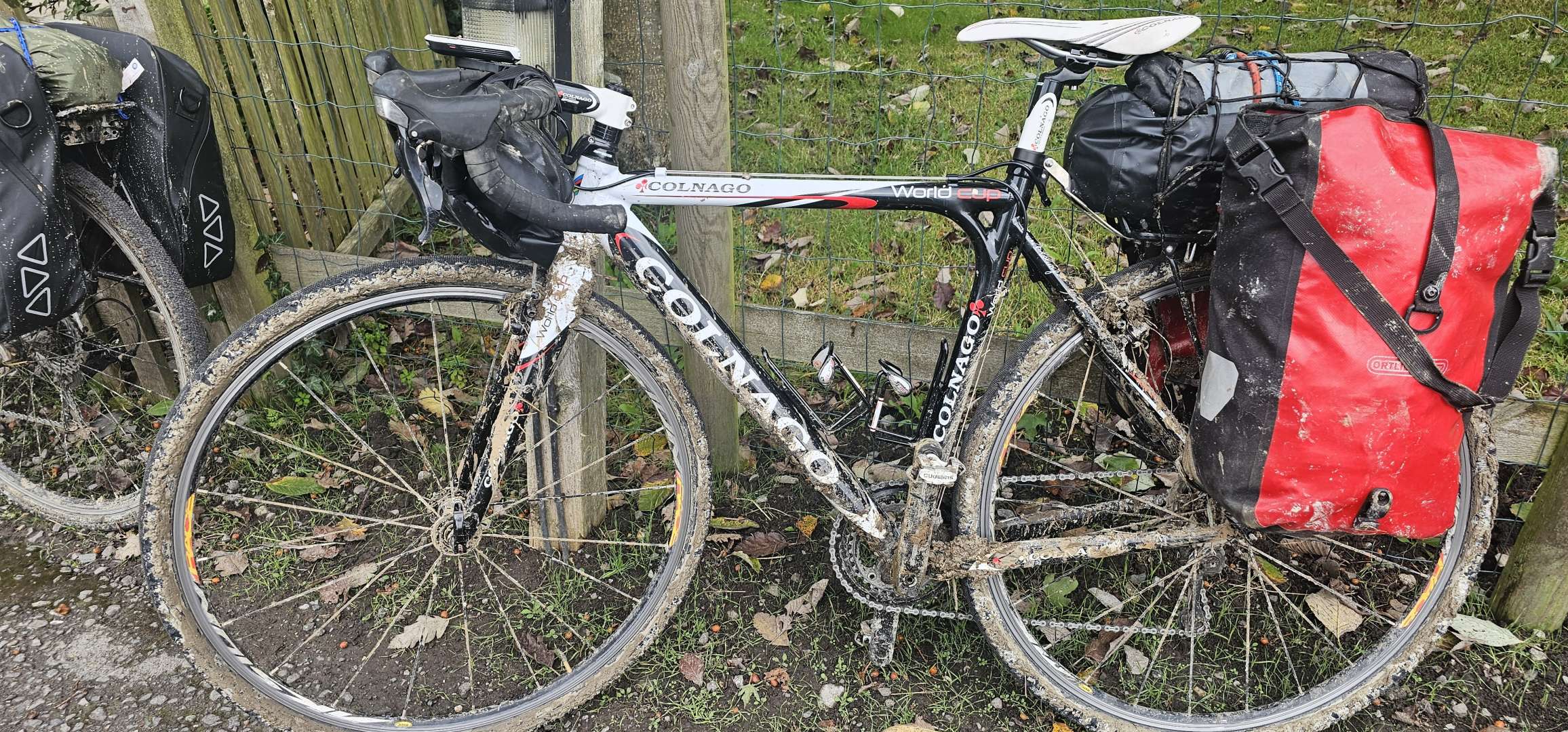 Colnago World Cup CX bike - managed a four day bike packing (with camping gear) on it but it's compromised in that it has no mounts, and the bodged pannier rack wasn't too steady. Held up fine, but handling was 'interesting' and I developed hand strain hanging onto the brakes on the descents - the canti brakes worked well, but required too much sustained 'pressure'. Of the three of us riding the KAW, two of us had canti's and struggled with hand strain. The Colnago is used regularly off and on road, and with the gearing and road wheels it's great for very hilly rides and steep hills.