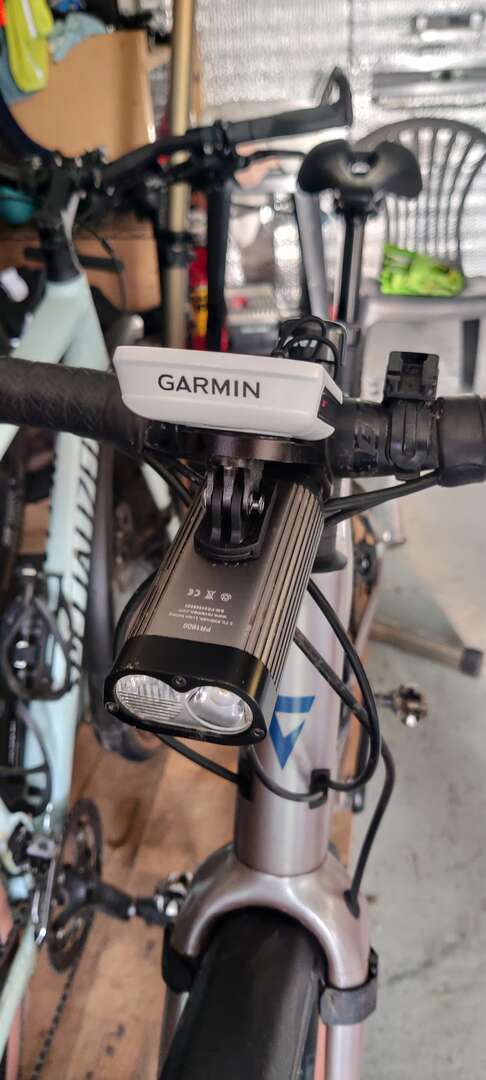 I have a Ravemen FR300. It mounts on any out front Garmin mount and the Garmin just mounts on top of the light. I think there's a more powerful version now?