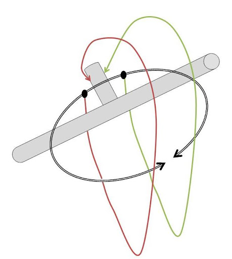 It's basically a webbing "belt" which fastens round the dry bag load (bag is held vertically against the bars), then sewn onto the "belt" at right angles (dangling towards the ground) are two straps . These straps wrap around the bars (either side of the stem) under the bag and over the top to fasten under the stem with a cam.