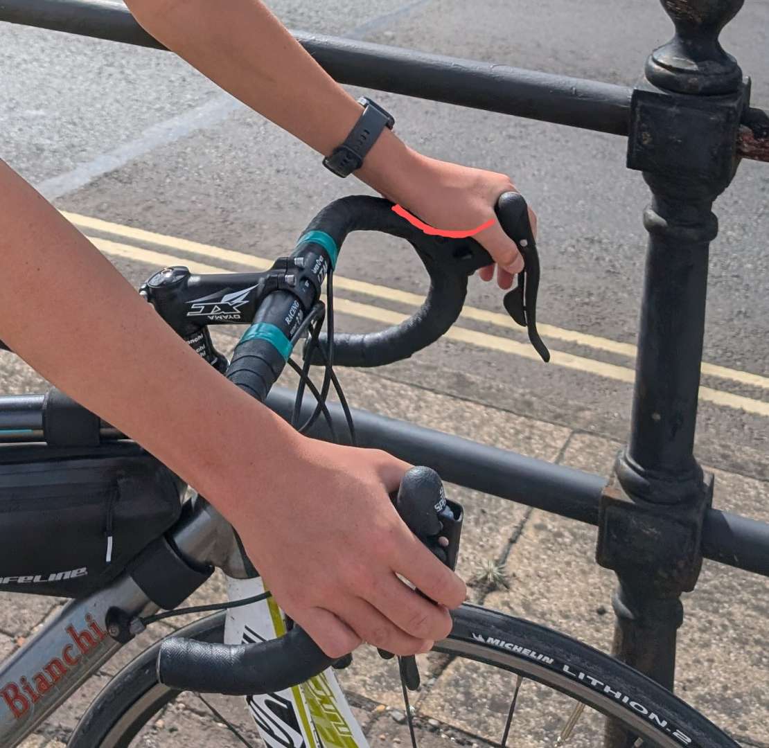 That shape will give you a little V at the base of the brifters and an awkward kink at the wrist. That might be contributing to you favouring gripping at the base of the brifters as it doesn't aggravate the wrists.