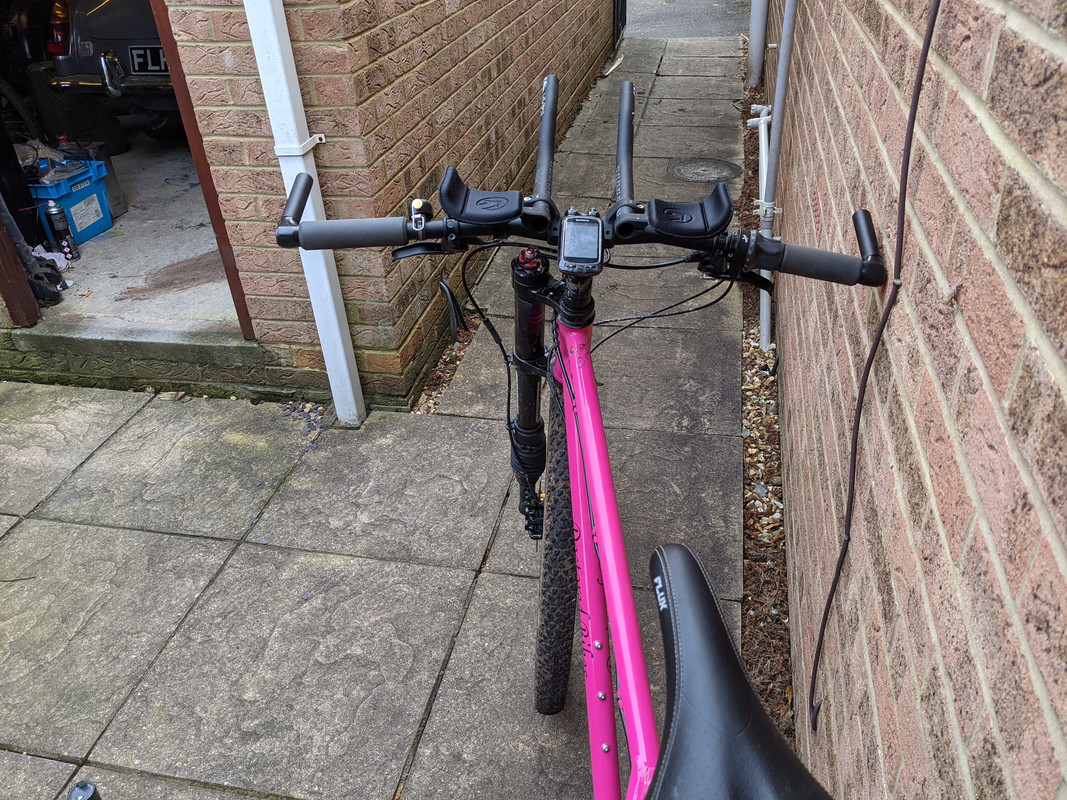 Realised that the Fleegles might have been part of the issue in the past, the bends effectively put my hands 3cm further forward, so I was probably more stretched than on the road bike!