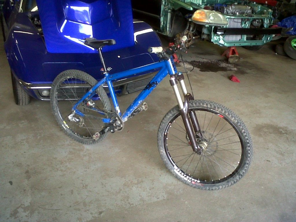 So I have a blue rolling chassis with white Revelations and stem, a set of Truvativ Team Noir bars, XT brakes, SLX cranks, MG1 pedals, and Roval Traversee rims. But no mechs, chain, or seatpost