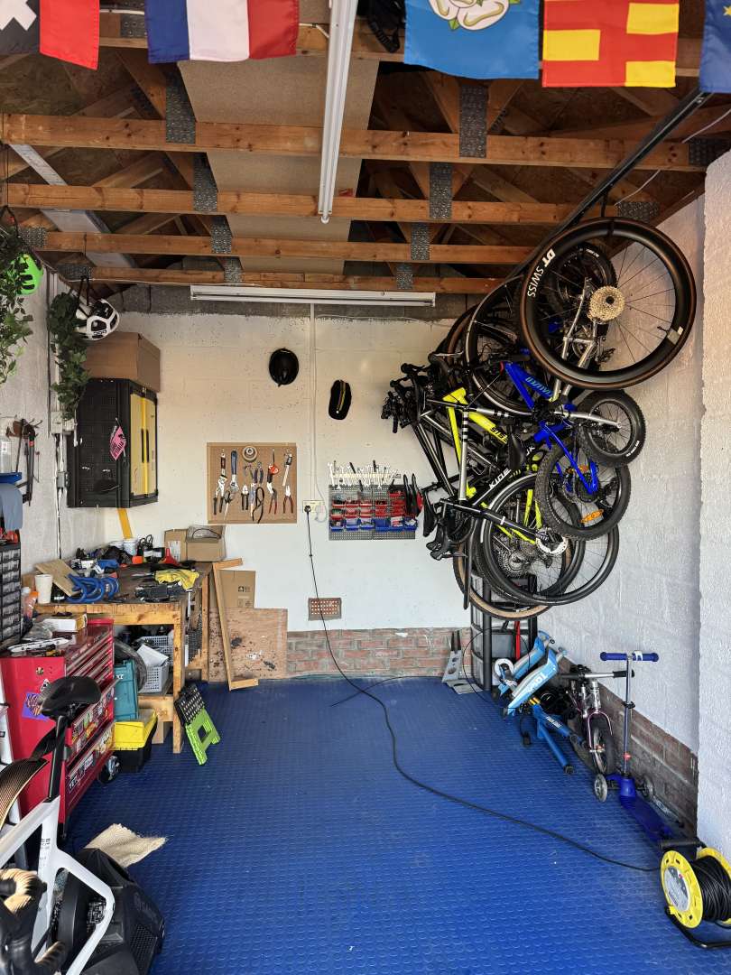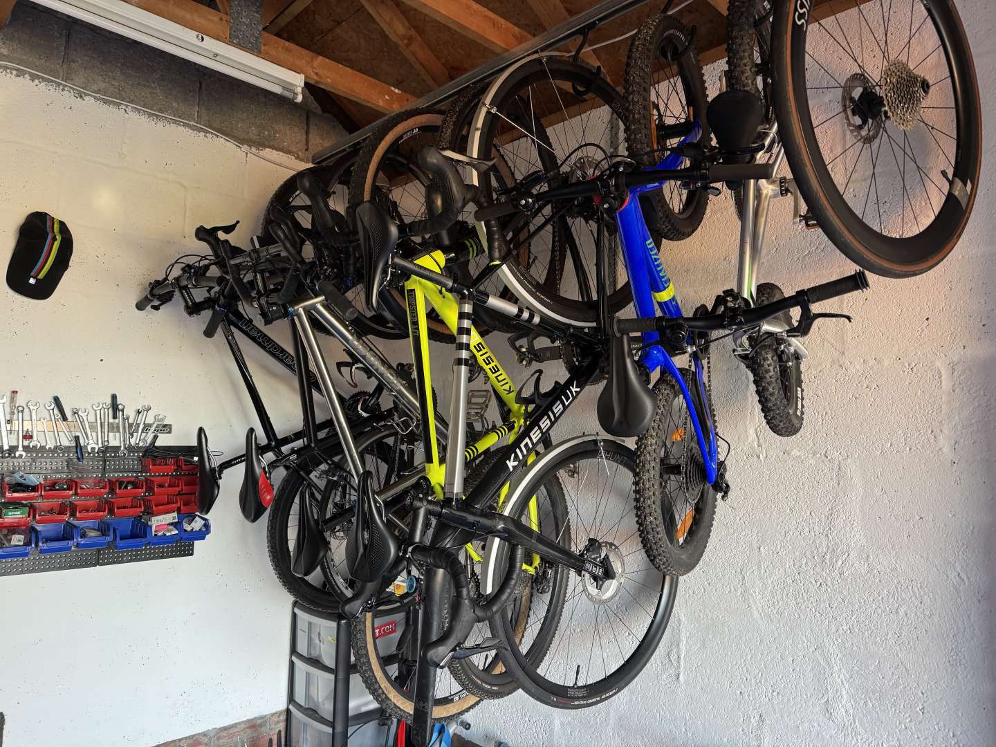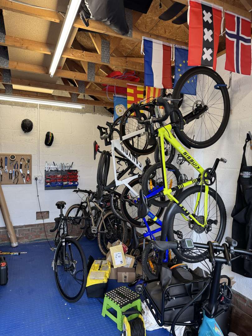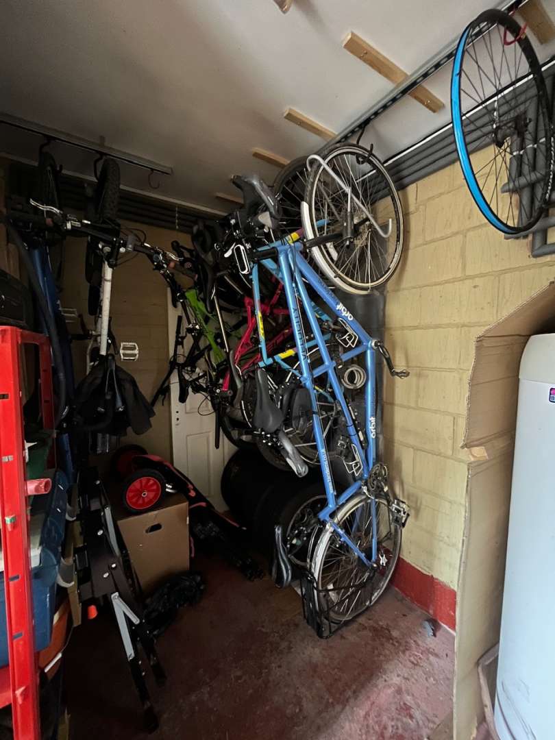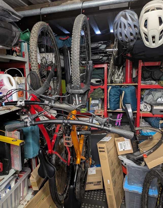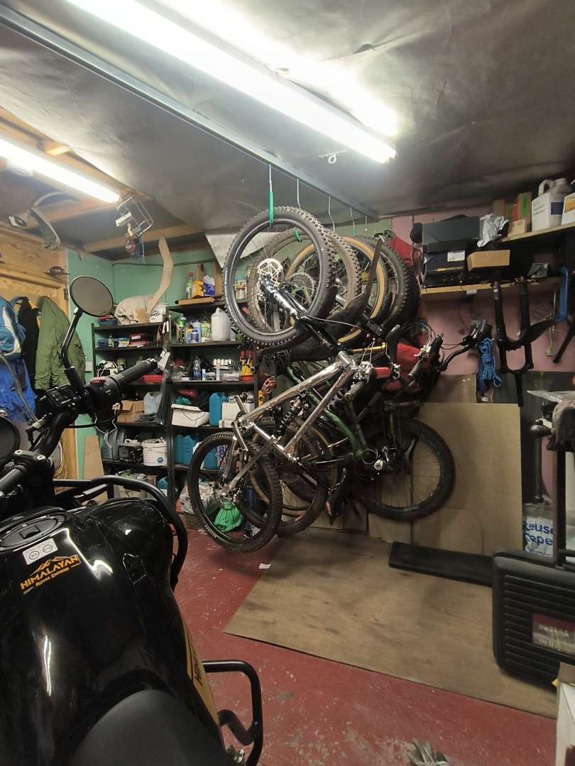I then have 2 other bikes hung from S hooks on a scaffold pole at the other end of the garage. I used to have a few bukes hung from saddles on the scaffold pole and other under them in a floor bike rack thing, but that just meant I couldn't get to anything....