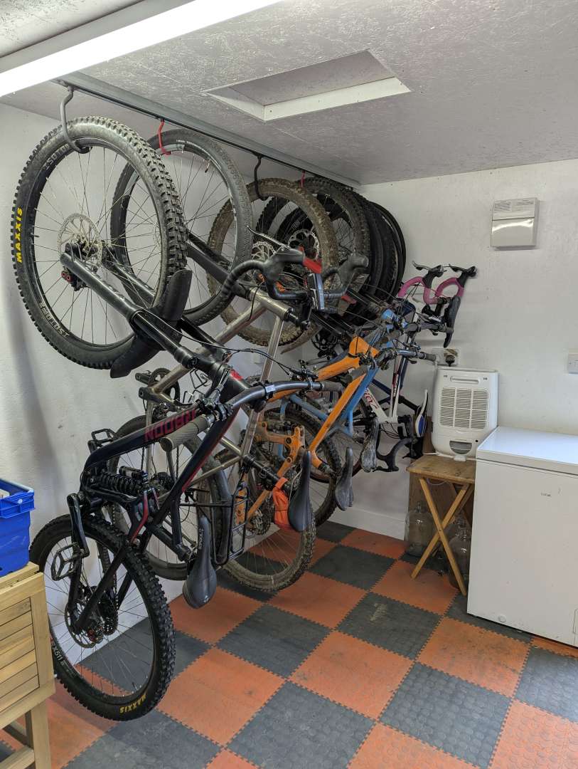 Any way, couple of photos of my set up now. I have my road bike at the end hung off the rear wheel, then my hardtail hung off the front wheel, this is where the height is an issue as it literaly only just fits with the rear wheel on the ground. Then I have 2 enduro mtbs that are hung from the rear wheels because I neve put the front wheels on when at home, as they go in the van on fork mounts attached to a peice of wood. This means I can rotate the bars to give easier clearance for my daughters bike between them and means she can get it out.