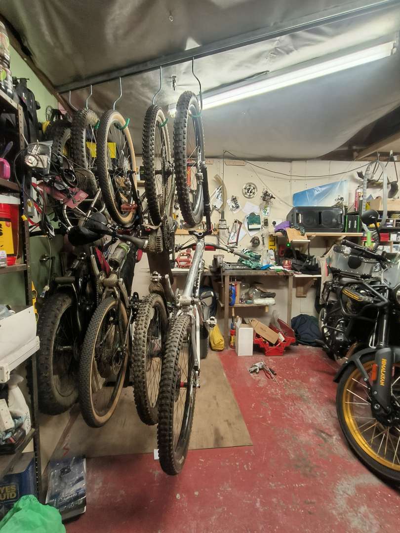 Only issue currently is the Cotic Solaris in a size large is about 2cm too long so will be experimenting with shortening the hook length this weekend. Shed is only 2.2 high after the channel droppers under the joists and a bit out from the apex i've just run a little short of room.
