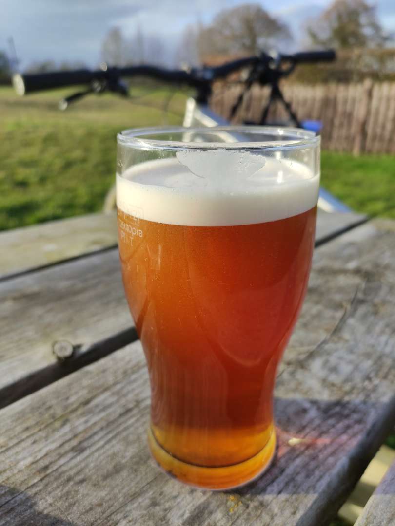 First ride in nearly a month, for various reasons. Amazing conditions only found a couple of bits of slop. First beer garden pint of the year as well 😁