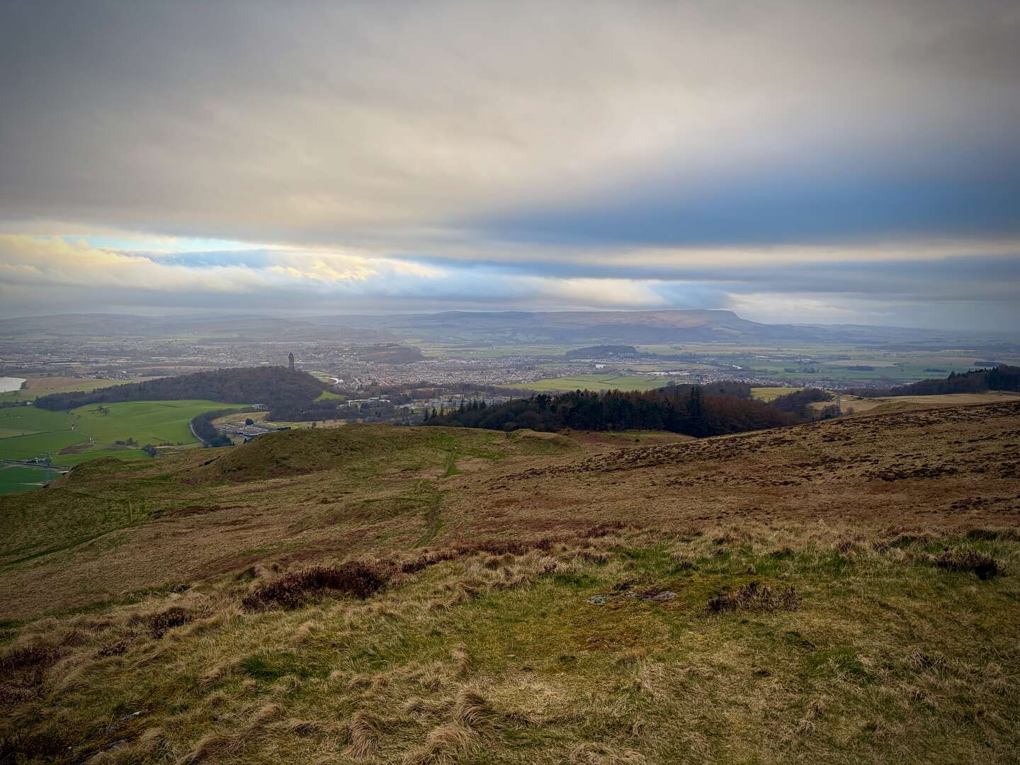 Even the trail conditions were good: better than expected despite a lot of rainfall on Sunday. Halfway up Dumyat, Stirling, at the junction down towards Witches Craig. Stirling Uni and Wallace Monument in the foreground, city of Stirling inc the Castle further back