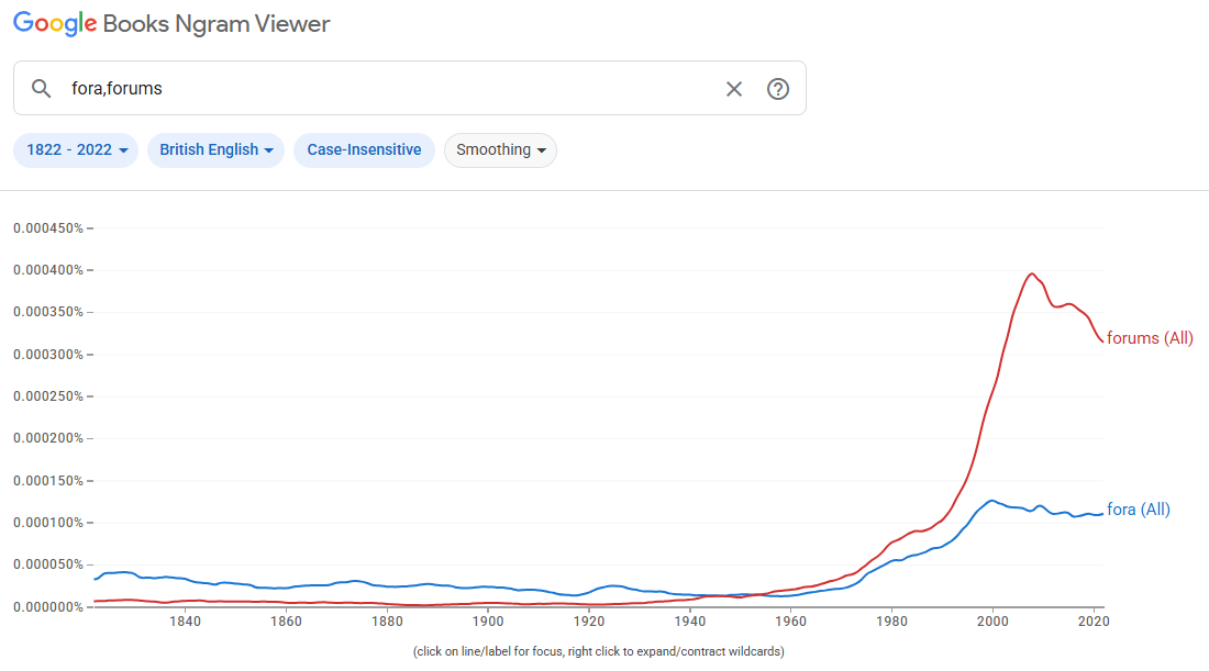 In any case, I ran it through Ngram covering a couple of hundred years (it only has data up to 2022). "Forums" is what's in common usage by a long way, whether it's correct or not: