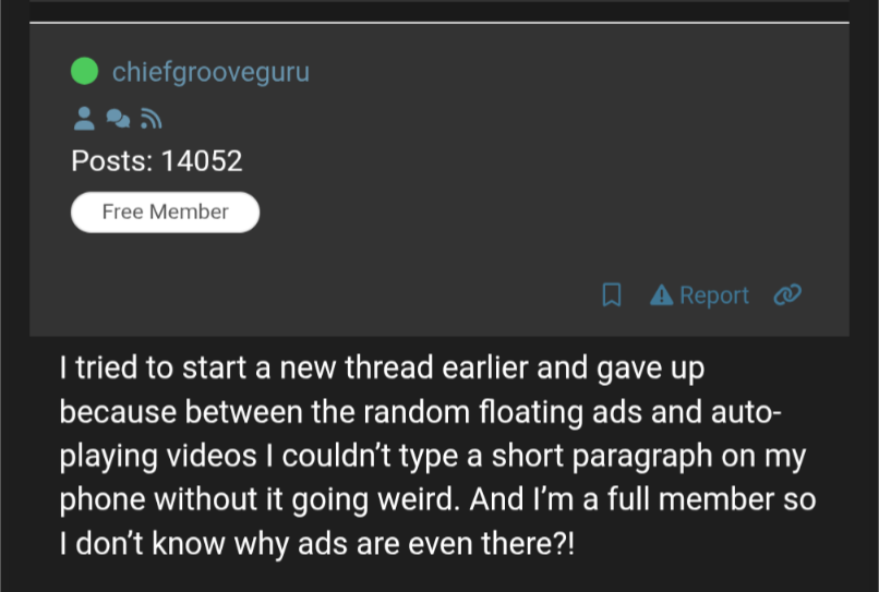 I tried to start a new thread earlier and gave up because between the random floating ads and auto-playing videos I couldn’t type a short paragraph on my phone without it going weird. And I’m a full member so I don’t know why ads are even there?!