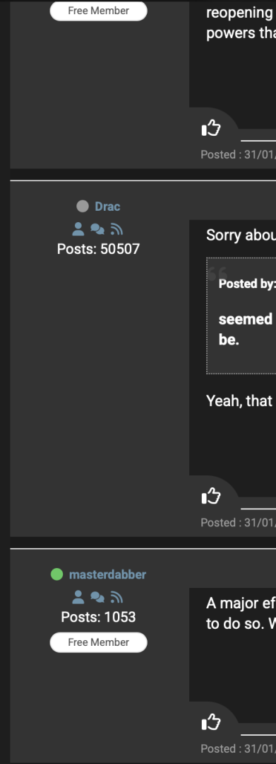 Performance on thread loading appears to be proportional to the size of the thread. A new thread loads near-instantaneously where as (say) the Trump thread takes ages. I am not a DBA but this is, I presume, an SQL issue? I'm guessing that the query is requesting the entire thread and then displaying what's needed rather than only hitting the database for the data actually required. This would explain why it initially displays page 1 before hopefully jumping to page [whatever].