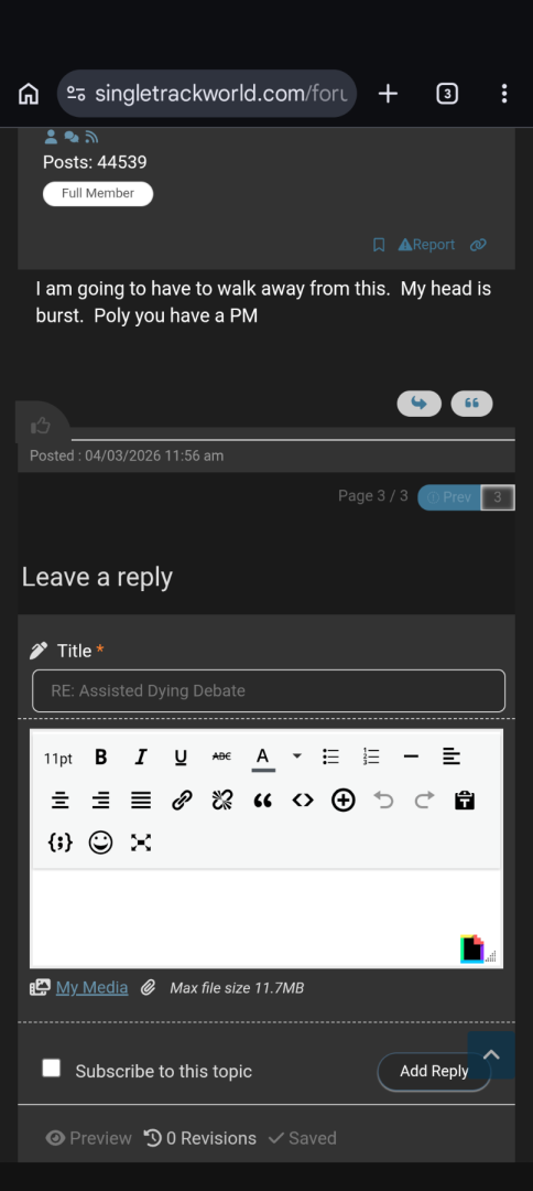 IME the forum is currently unusable for posting, see https://singletrackworld.com/forum/off-topic/assisted-dying-debate/paged/3/#post-13705663