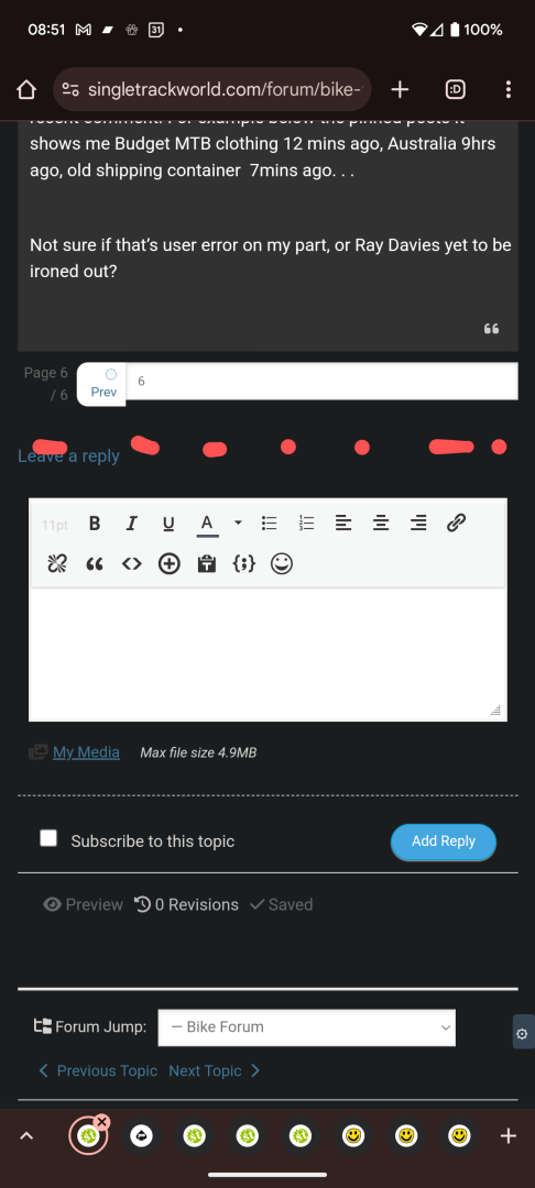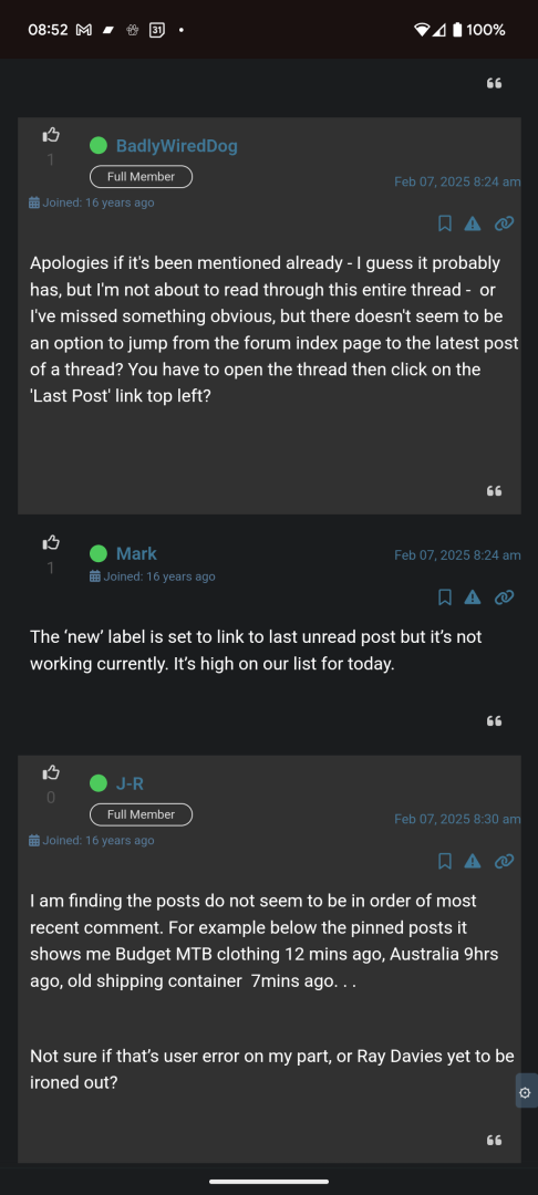 I am finding the posts do not seem to be in order of most recent comment. For example below the pinned posts it shows me Budget MTB clothing 12 mins ago, Australia 9hrs ago, old shipping container 7mins ago. . .
