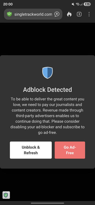 Once again you are suggesting I'm breaking the rules. I'm not and never have. Your crazy power hungry ads probably cost me more than 12p a year in electricity! If you want to go 100% subscription only - then do that but don't say its Ads or Subscription and then accuse people who accept ads of being the problem. There is something wrong with how your service is set up which isn't affecting other Uniconsent publishers. If you don't believe me I'll take a video this evening and show you.Singletrack is pay to play - it always has been - either with or without ads+subscription. 40k+ users/month are not holding up their side of the deal by blocking ads. That's now too much for us to absorb and ignore and it's a price being picked up by subscribers as it loses us thousands/year.
