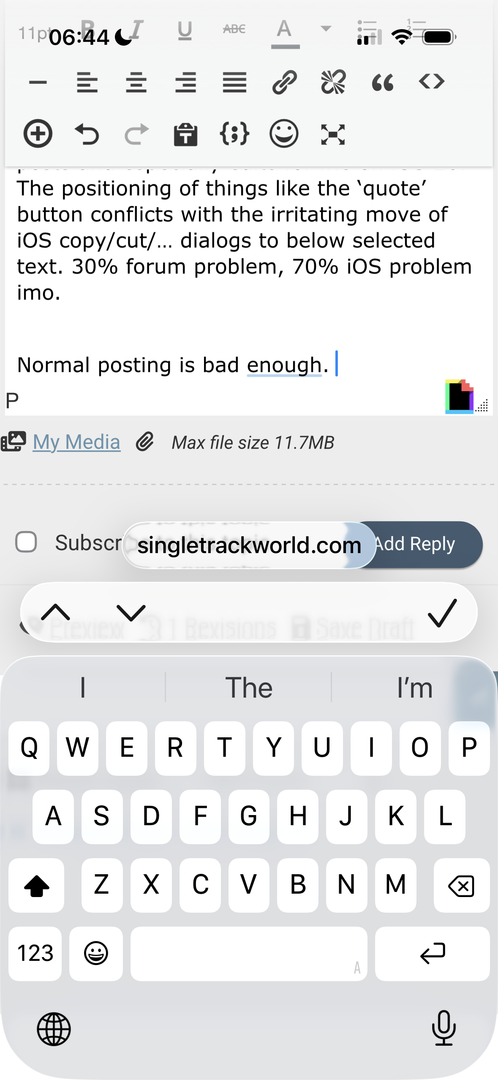 Usability of the forum is a real challenge for me with posts and especially edits on iOS 26. The positioning of things like the ‘quote’ button conflicts with the irritating move of iOS copy/cut/… dialogs to below selected text. 30% forum problem, 70% iOS problem imo.