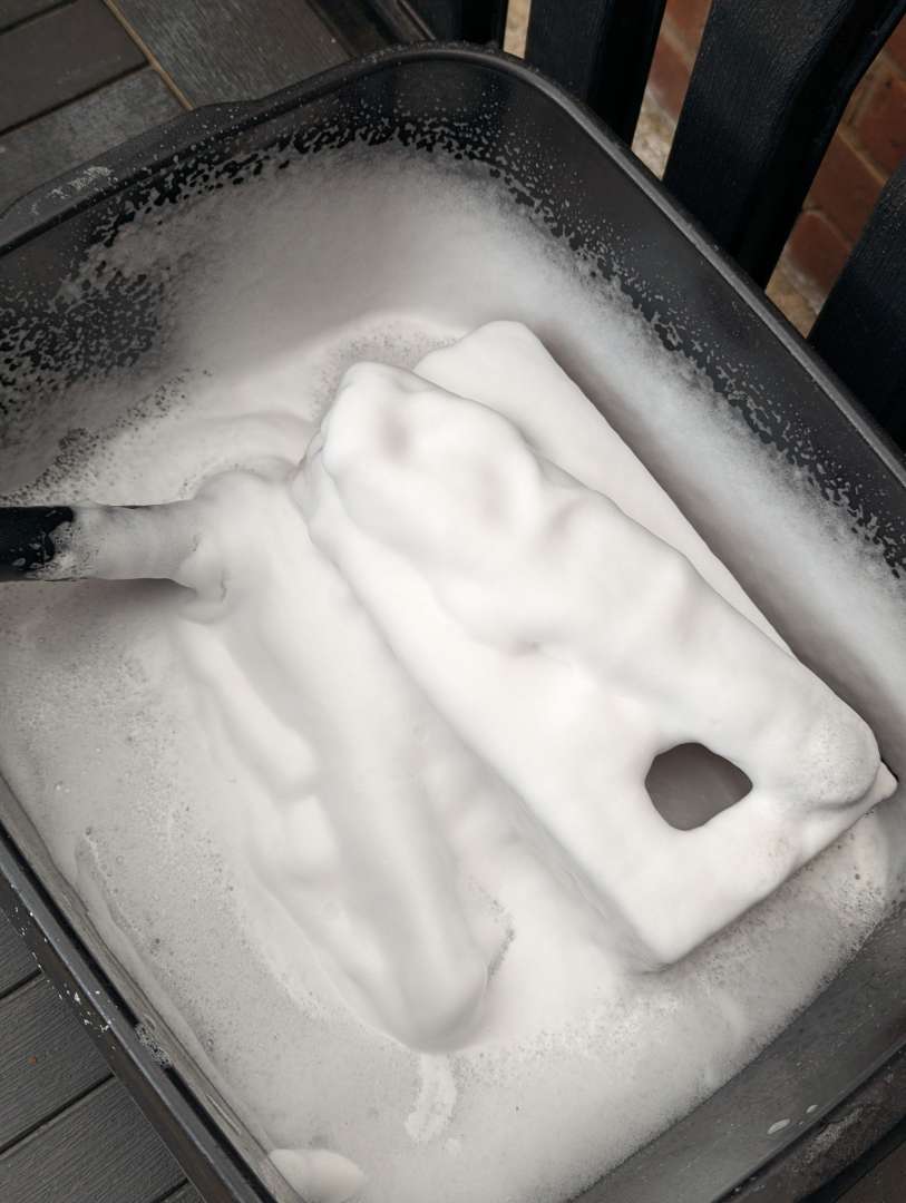 I use drain cleaner instead of oven cleaner so I can see it working rather than guessingย how long to leave the foam on.ย