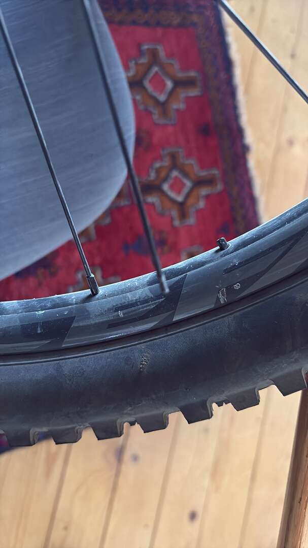 Fitted new rear tyre WTB Judge high grip and Peatys Hi Flow valve to the eeb. Used the tyre monkey tool for this first time. Great for breaking the sealant crust on the old tyre. Snapped a pedros lever. Cushcore lever and industrial zip ties otherwise made light work of it.
