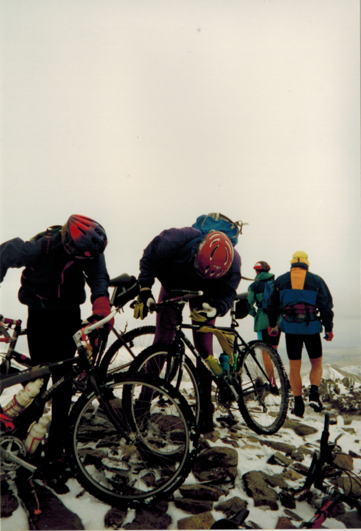 Trip up Helvellyn in the snow. This was a total epic - rode out from Keswick we were very unprepared and ended up freeriding across trackless snowy slopes down to Thirlmere. Placcy bags over winter socks and xc spd shoes! This must have been around April 1994 as on the way home we learned that Kurt Kobain had shot himself on the news on dad's car radio