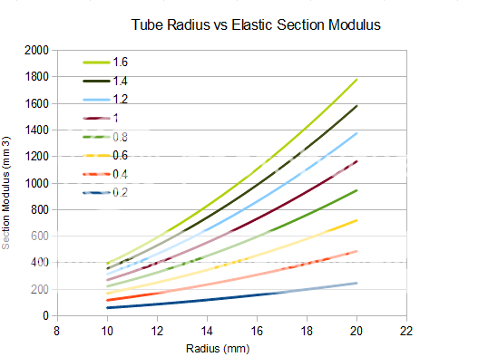 The graph below shows tube thickness vs section modulus for various thicknesses. So, at 0.8mm wall thickness, if you double radius from 10mm to 20mm you go from 222 mm3 to 946 mm3, but if you double thickness at 10mm from 0.8 to 1.6 you from 222 mm3 to 394 mm3, or at 20mm you get 946mm3 to 1781mm3.