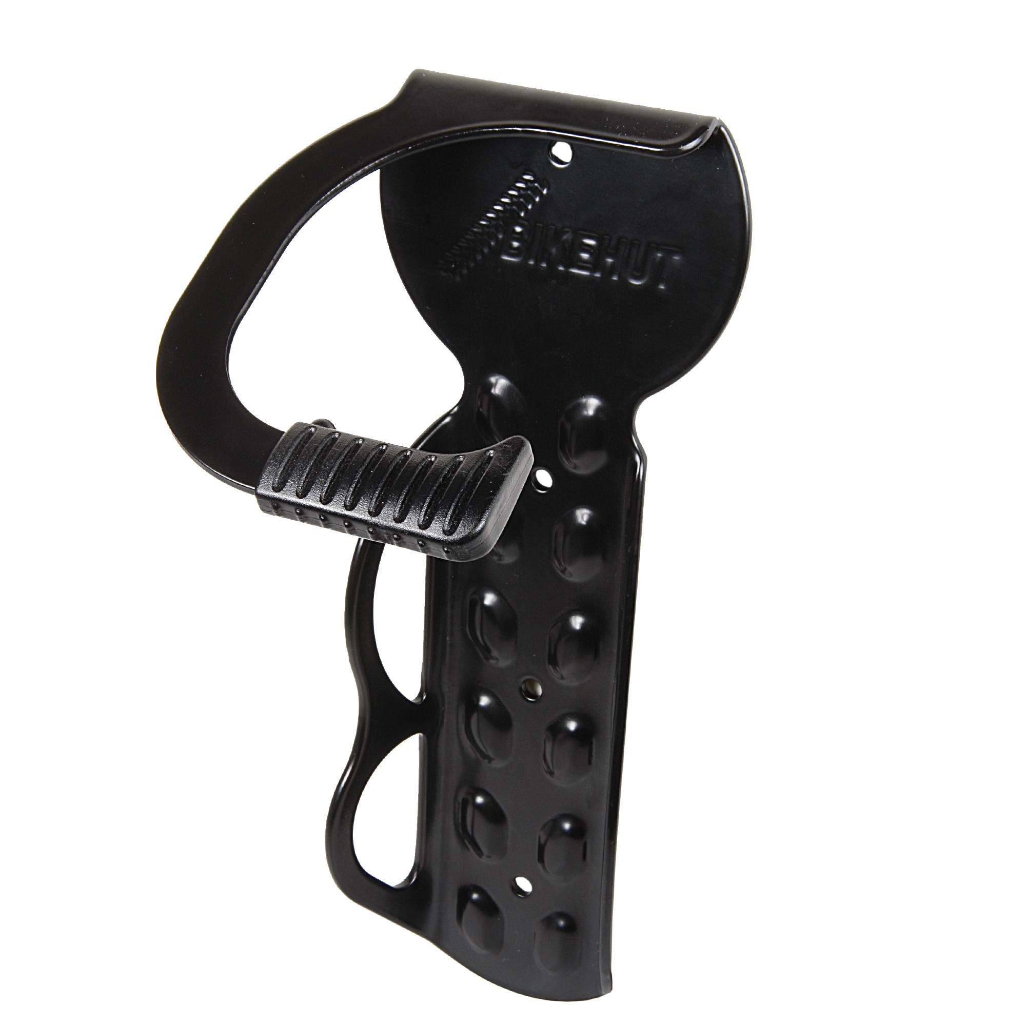 I've just put up three of the front wheel hook/ tray things easily found on Amazon and eBay. Seem fine so far. Perhaps a bit flimsy but 4 screws each in a breeze block wall should be ok.
