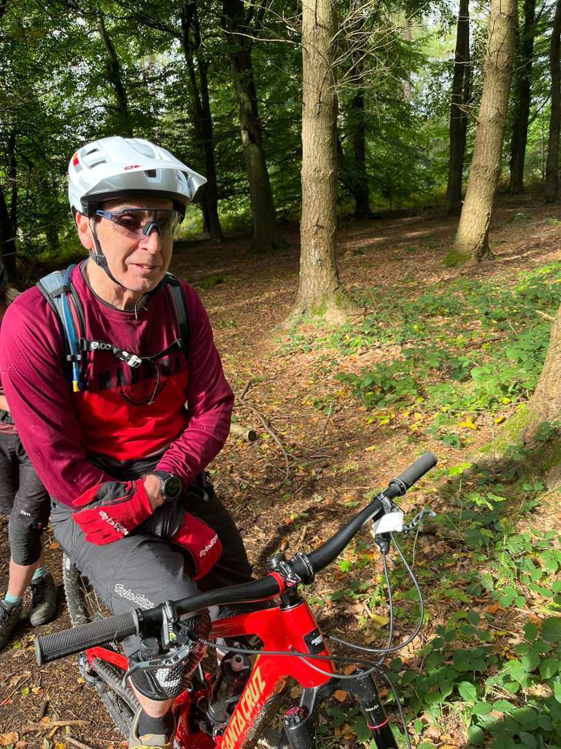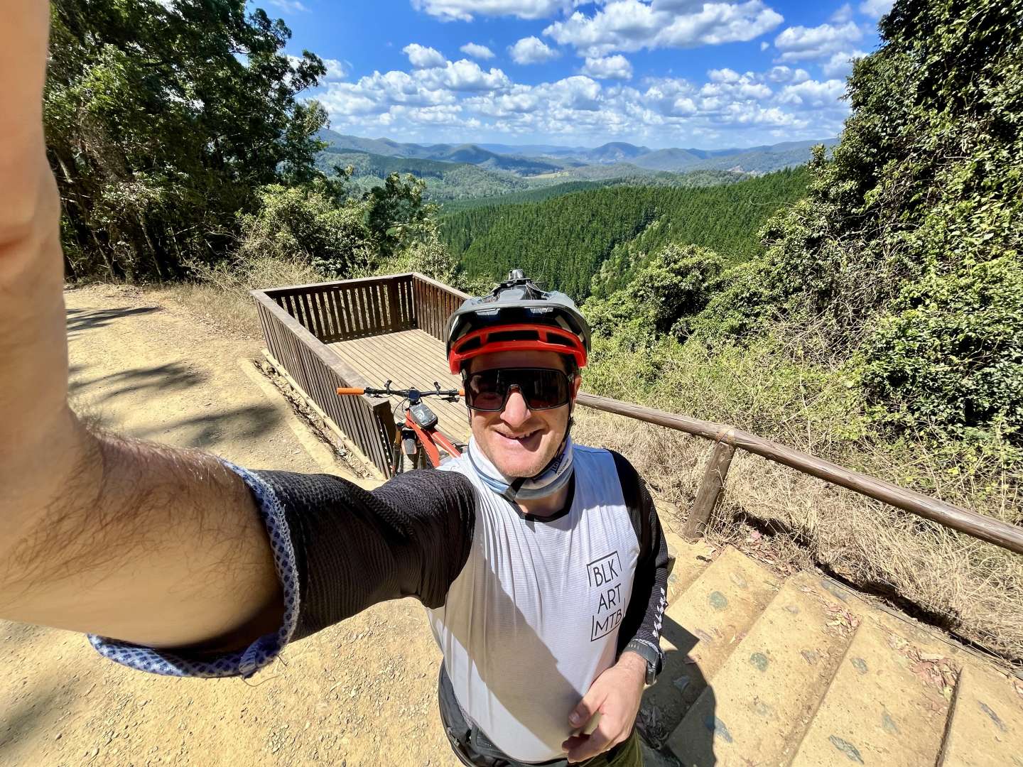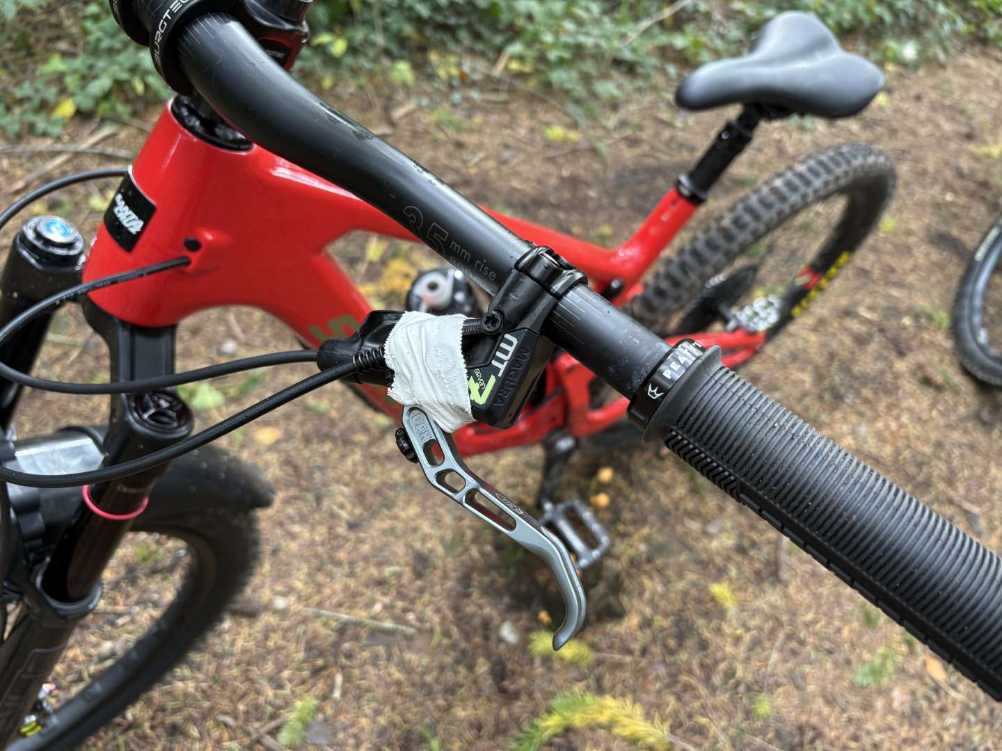 The conflicted face of a man very much enjoying riding his bikes on still prime FoD trails, and dealing with a Magura brake that has attempted to disassemble itself on those trails! Bandaged it up and cracked on. All good.ย