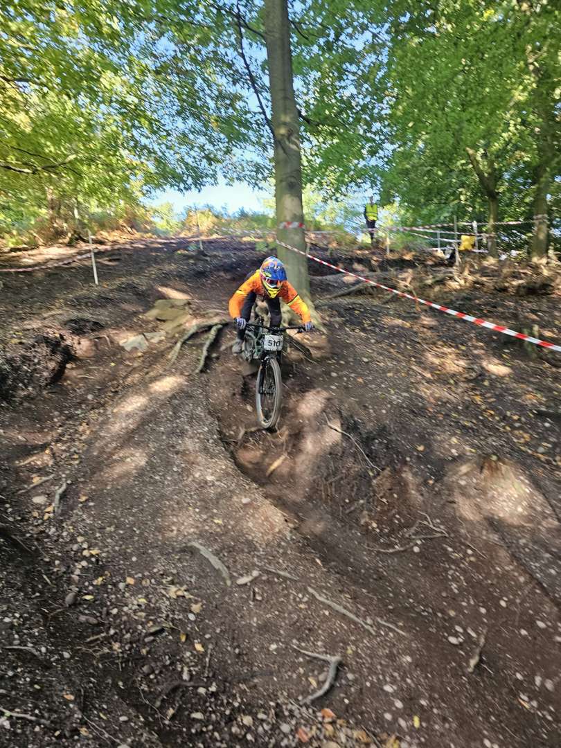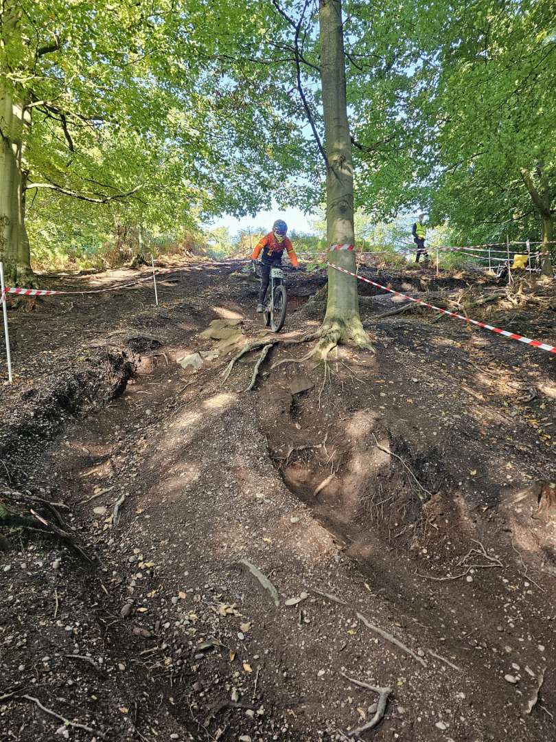 First race round down and she's nailed the top & middle section, I was waiting at the bottom section as she came off the last drop - nicely off it only to land slightly off line and catch the edge of a stump with the front wheel - folded ang hit the deck. Quickly up and back on the bike. Put her in last - she wasn't overly happy but was pleased with how it went up until then.