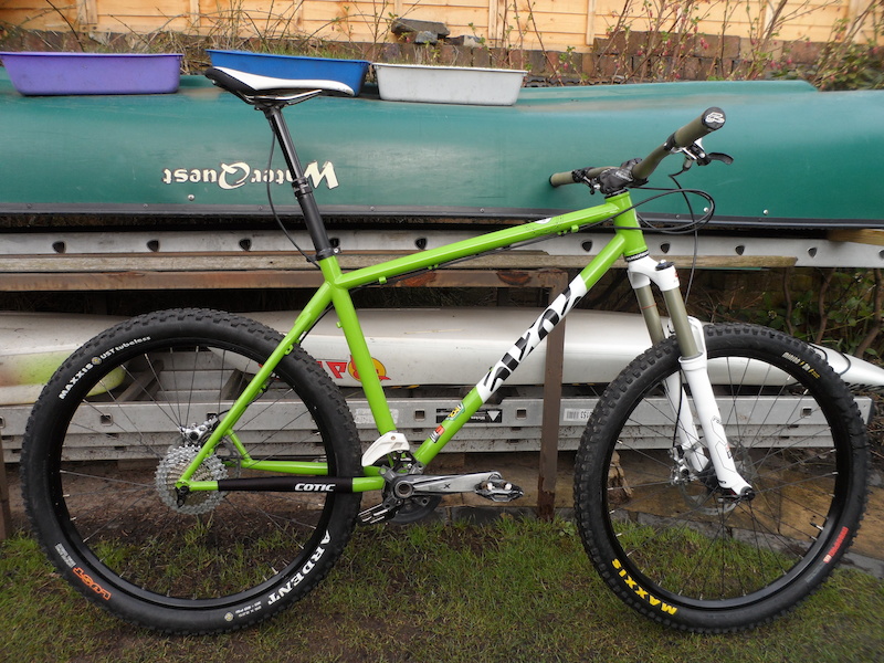 My new Cotic BFe, which is very nearly done. The chain ring arrived today so it was fitted and I drilled out the cable stops to run a full outer cable on the rear mech, but I still need a mech (SRAM X9 Type 2) and shifter (SRAM X0) to arrive from Germany to finish it. I'm also waiting on some olives and barbs to shorten the brake hoses. I shortened and bled the Reverb and heli-taped it today too.