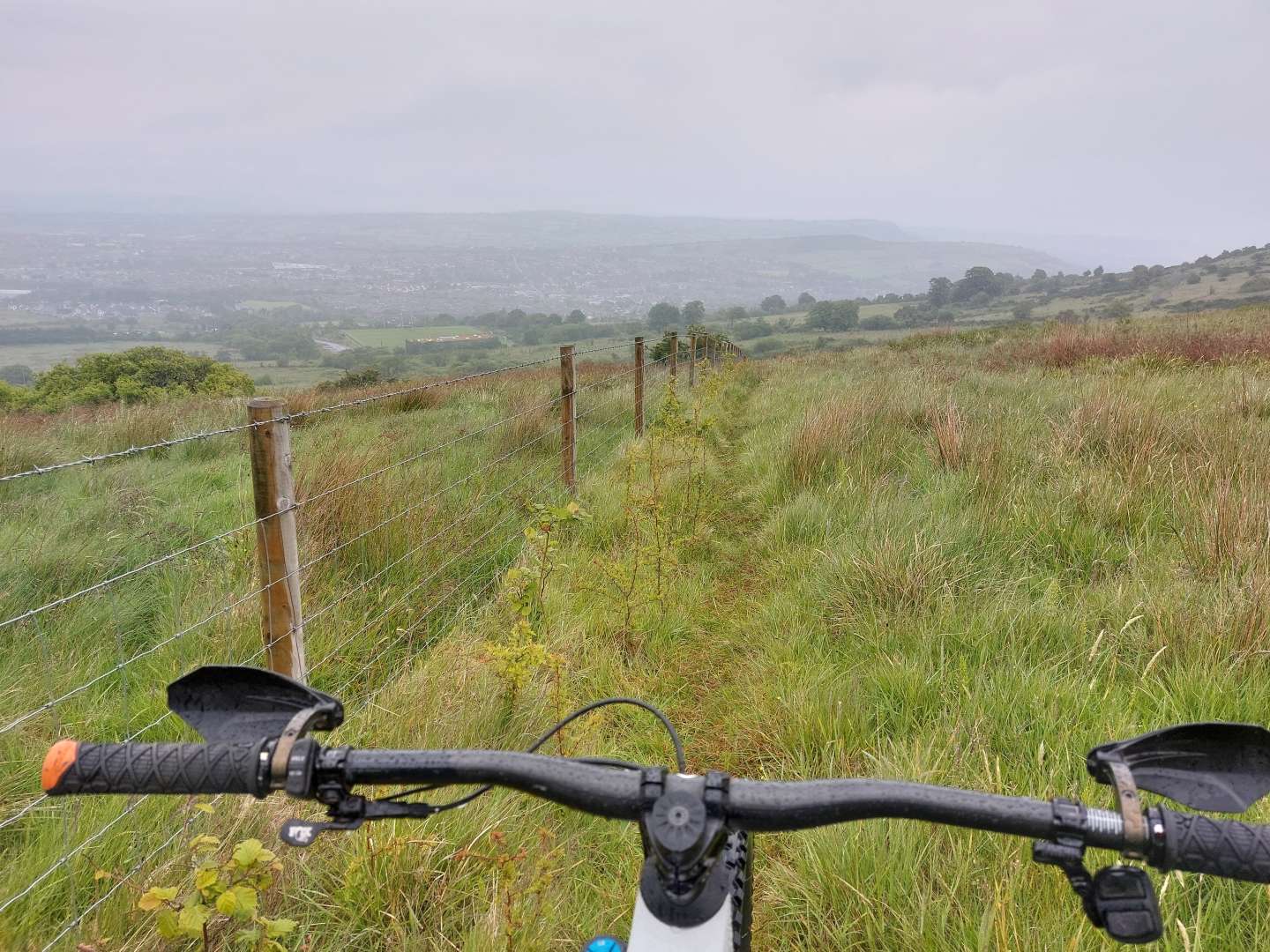 Despite having driven through a 20min massive downpour just before heading out to ride, the trails, certainly out in the open, seemed pretty dry. It's greasier and damper in the woods, but not exactly muddy.