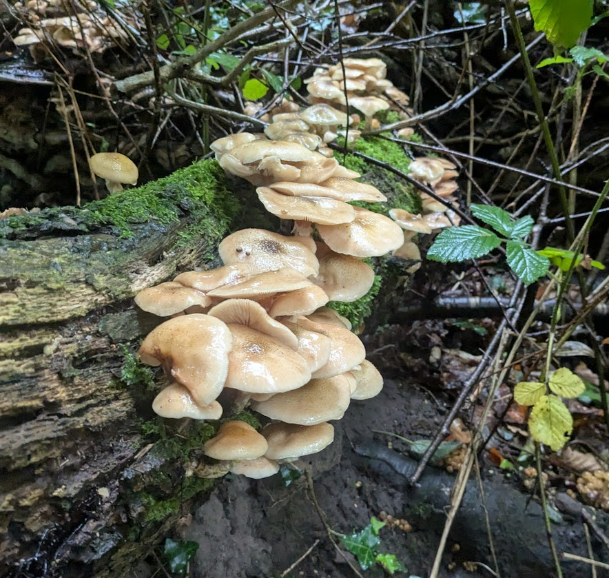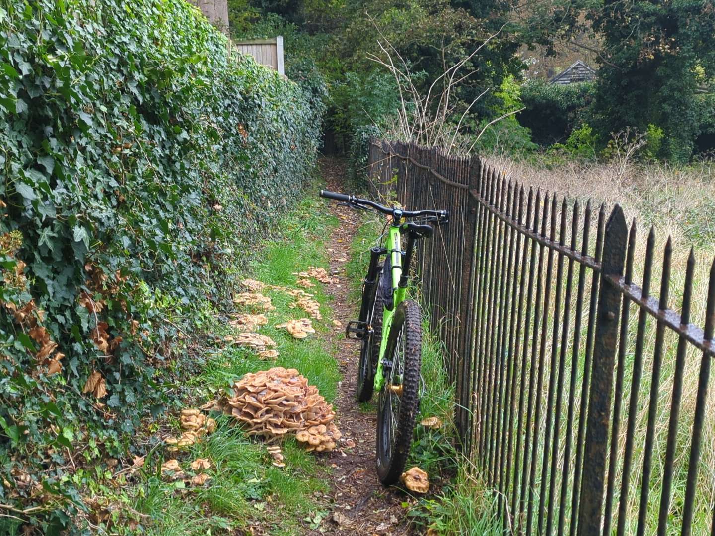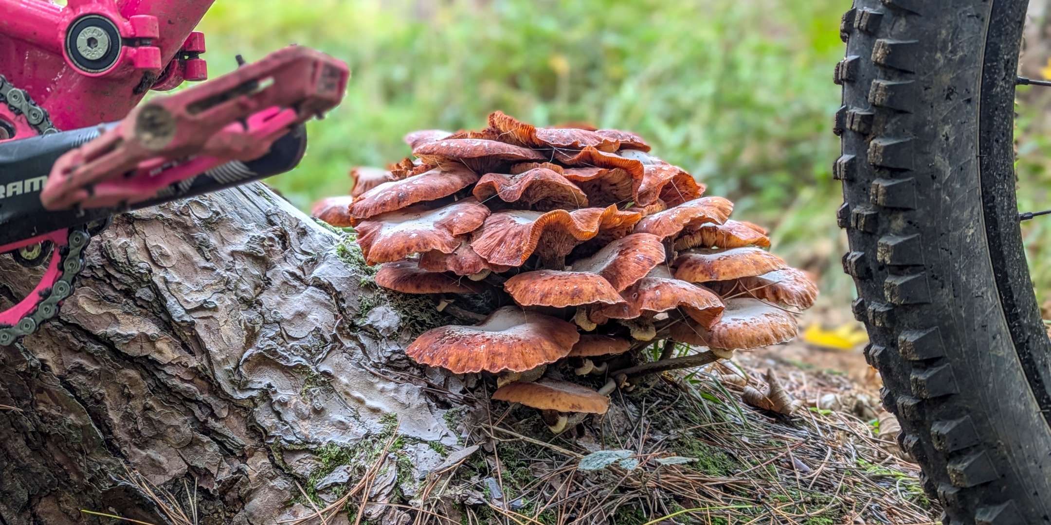 Wasn't planning on riding this morning, but the forecast changed and I got a local spin in. Shrooms everywhere - could still be there now if I'd stopped to snap every clump I spotted.