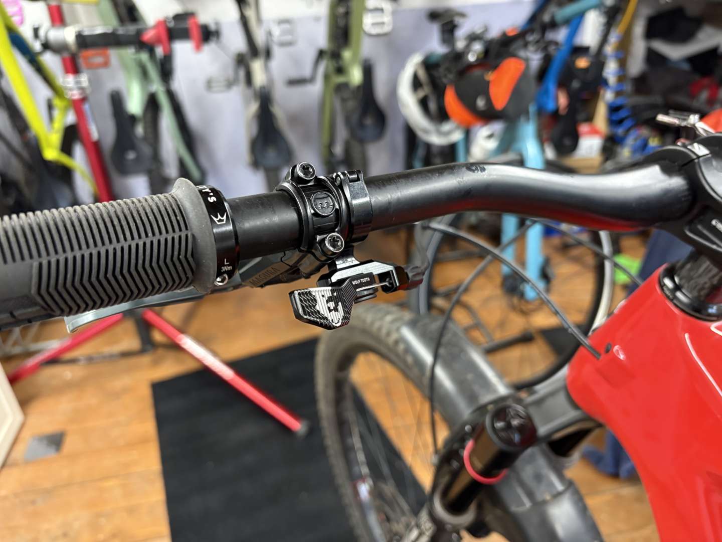 Having fitted a longer dropper on the 5010 (last upgrade!), I'd attempted to keep the bar furniture clean by replicating the SRAM mount that housed the now removed Reverb. A combination of that mount being the SRAM ShiftMix (as I dumped the original SRAM G2s) and Wolftooth not having the greatest solution, the lever ended up in a terrible position unless you have a triple jointed thumb.