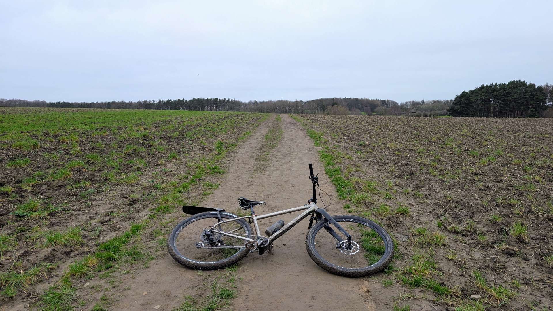 Quick 80 minutes this morning on the Vandal with fast tyres & rigid forks. Fast! Muddy in spots (I need to find a front mudguard solution for the rigid forks!). Just one boring grey photo!