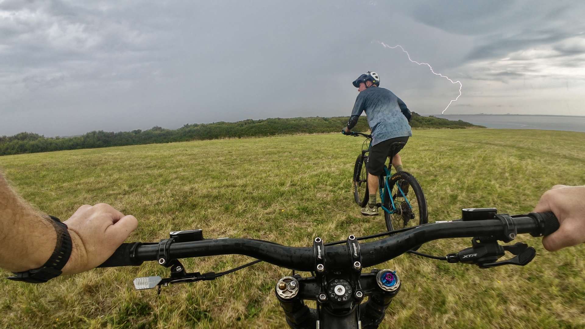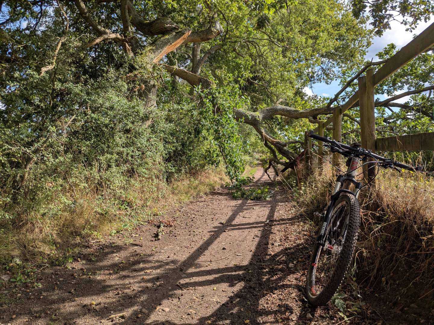 Took the old hardtail out on Friday. We've had a couple of blustery little thunderstorms this week and my shirt loop involved getting around 4 fallen trees, including this widow maker hanging over the bridleway.