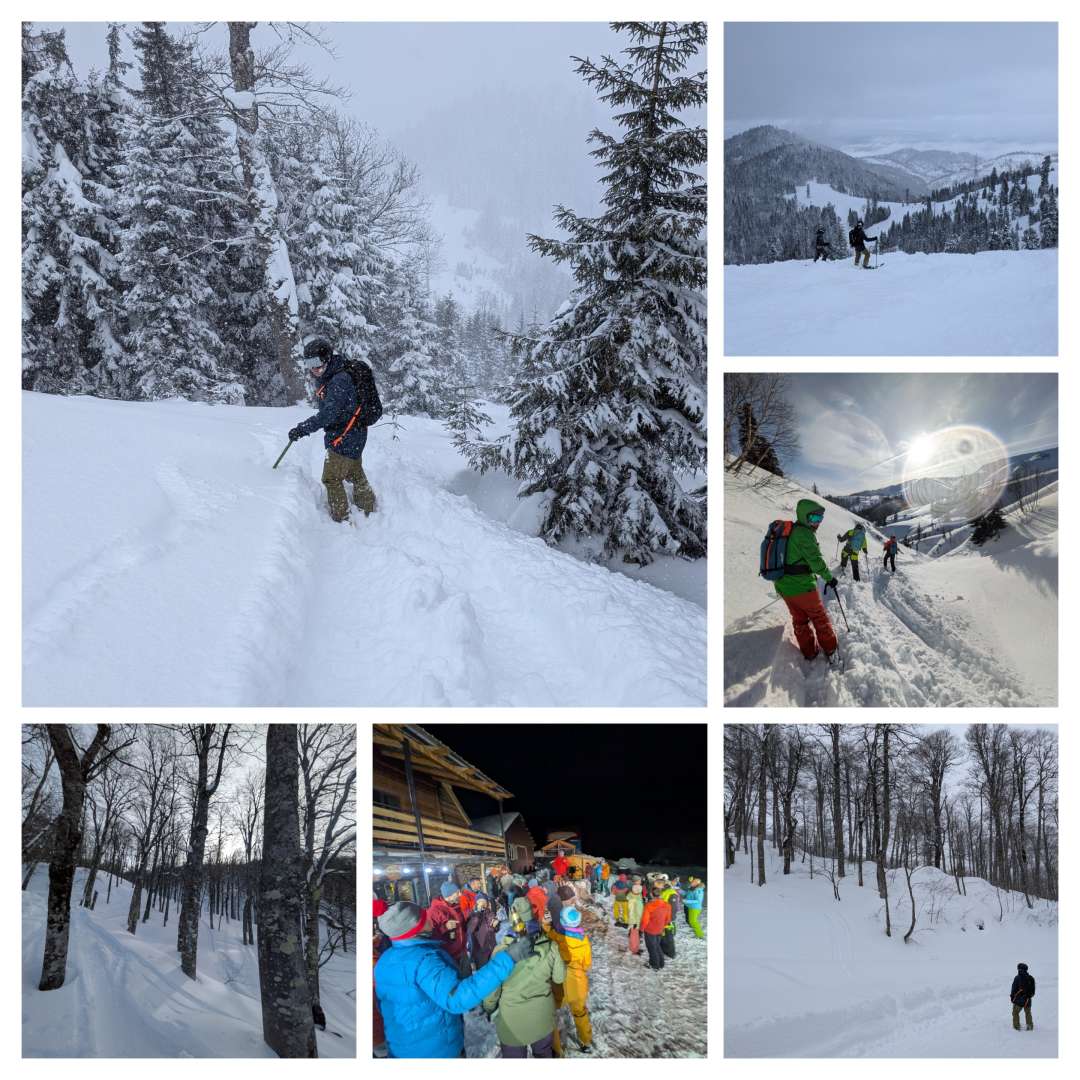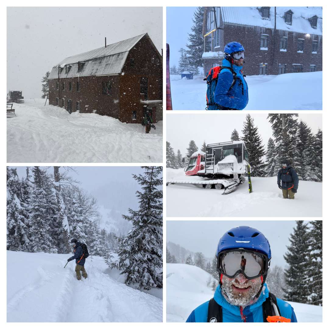 Arrived - it was snowing. 3 days of being guided around the local mountains skiing fresh lines every time. Then it dumped for 24 hours - chest deep powder skiing day (see the POW beard). Then 2 more days of skiing fresh tree lines - not tightly packed pines, nicely spaced leafless trees. Just astounding, absolutely got what we paid for.