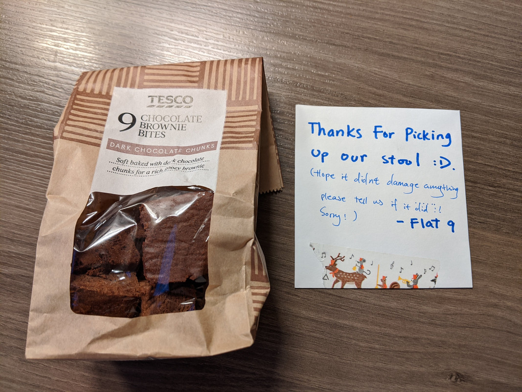 Yesterday evening I got home from meeting friends in the park and my step-dropping neighbours from this morning had left me an unknowingly sardonic thank you: