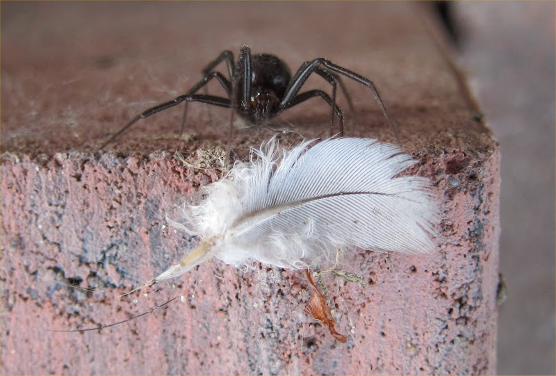 The first looks like a [i]Tegenaria duellica[/i] and the second a [i]Steatoda grossa[/i]if you haven't ID'd them. The feather I'm guessing a pigeon 🙂