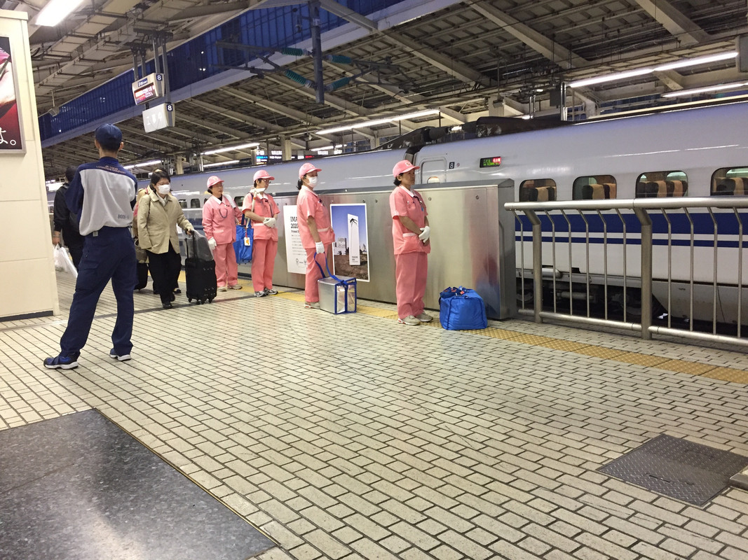 Sinkansen cleaning crew ready for ritualised rapid carriage cleaning