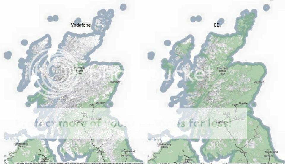Vodafone have been deploying 4G in the 800Mhz spectrum which travels a lot further than the 1800 Mhz spectrum that EE have used. So to get to their superior coverage EE will have deployed thousands more masts in Scotland than Vodafone.