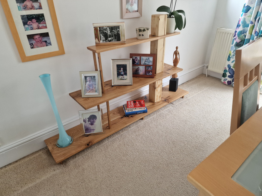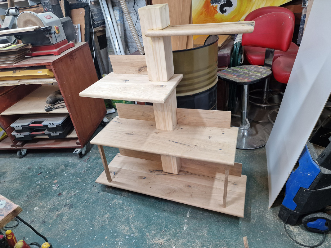 This leaves us with the problem of where to put books and the mini stereo. I am designing a second set of shelves which are definitely going to be bookshelves as I will add shelf backs to these ones. I have mocked up the design in the garage with what I have left of the oak planking and some other bits I have going spare. Really not sure how this one will turn out yet.