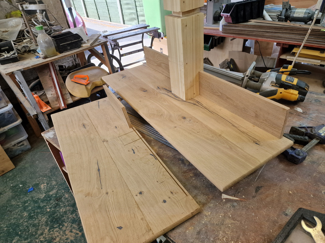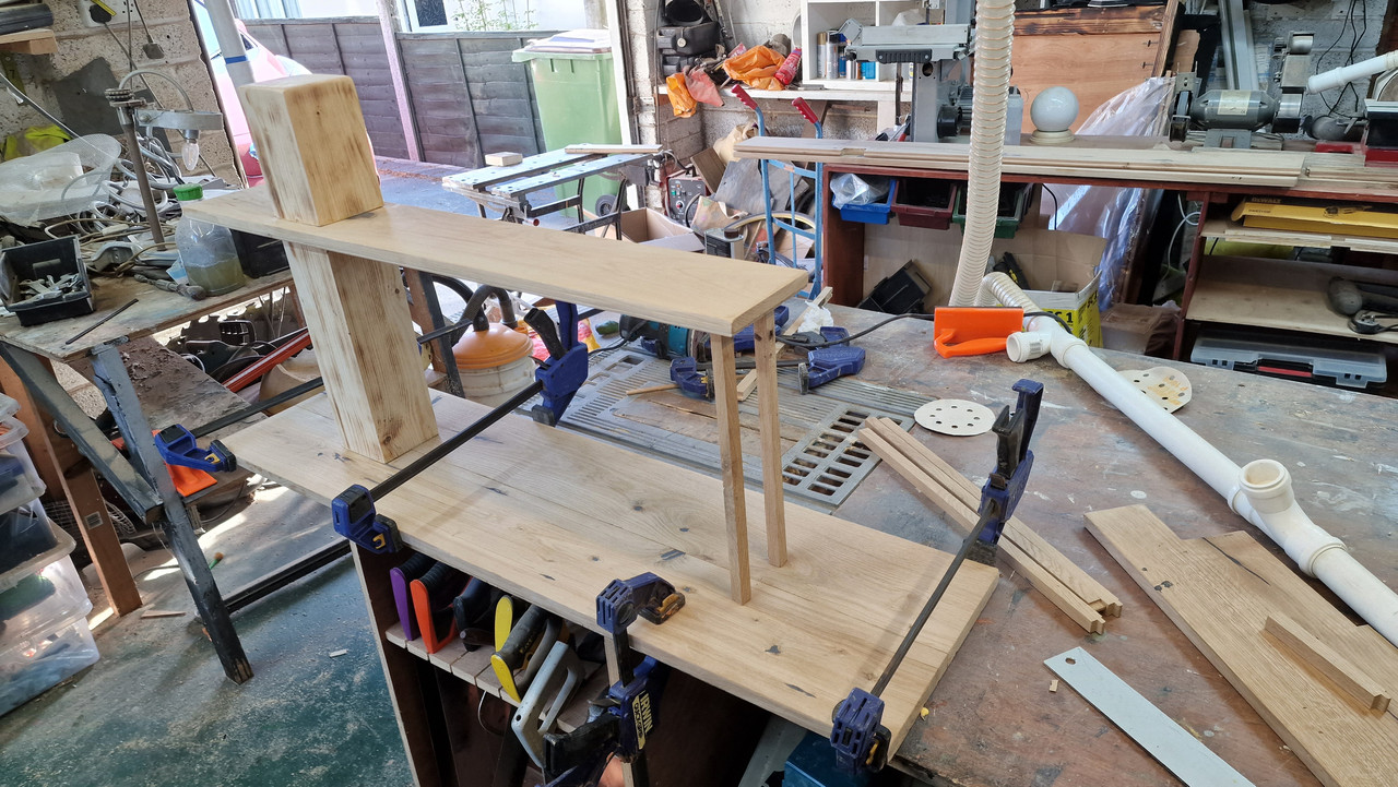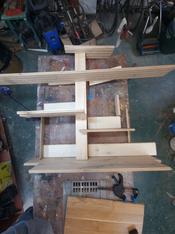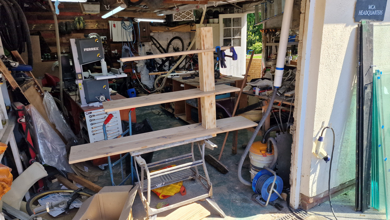 A useful morning in the garage. The first shelf is dry fitted and the second is almost there and artfully placed so you can see how the whole lot fixes together