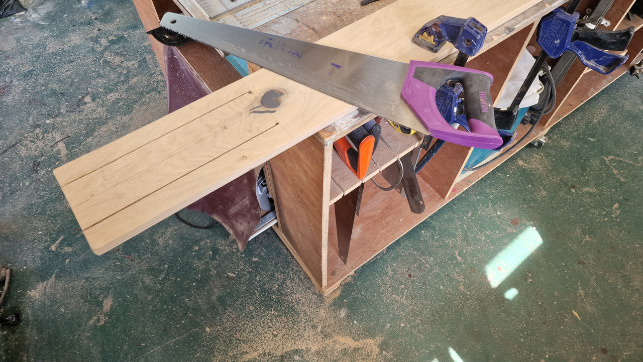 I needed to cut a long thin rip cut on the final shelf. The perfect job for one of those extra fine Japanese pull saws. Unfortunately, as you can see from my saw rack, I don't own one. Will the cheap B&Q saw do the job?